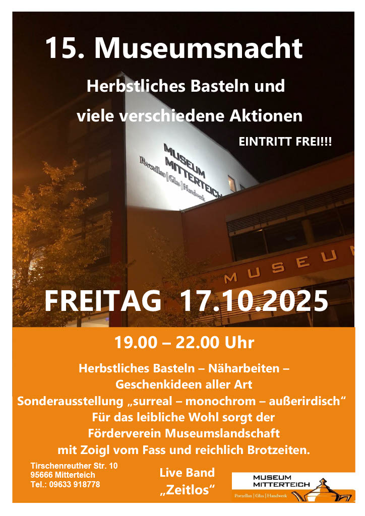 Das Museum Mitterteich befindet sich seit 2010 in den Räumen des ehemaligen Werks A der früheren Porzellanfabrik Mitterteich. 1886 wurde die Porzellanfabrik Mitterteich gegründet. In ihrer wechselvollen Geschichte entwickelte sie sich zu einem weltweit agierenden Unternehmen für die Produktion qualitativ hochwertiger Gebrauchsporzellane. 2005 musste die Firma schließen.